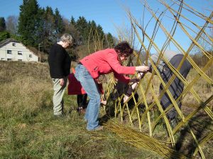 L’osier peut être utilisé sec ou « mort ». Les branches coupées sont tressées pour confectionner bordure, portique ou fascine… D’autres végétaux peuvent être utilisés : des branches d’érable, de noisettier ou de frêne. Ces réalisations ne nécessitent pas d’entretien, mais devront être remplacées après quelques années. Ces structures éphémères contribuent à la création de jardins en mouvement.